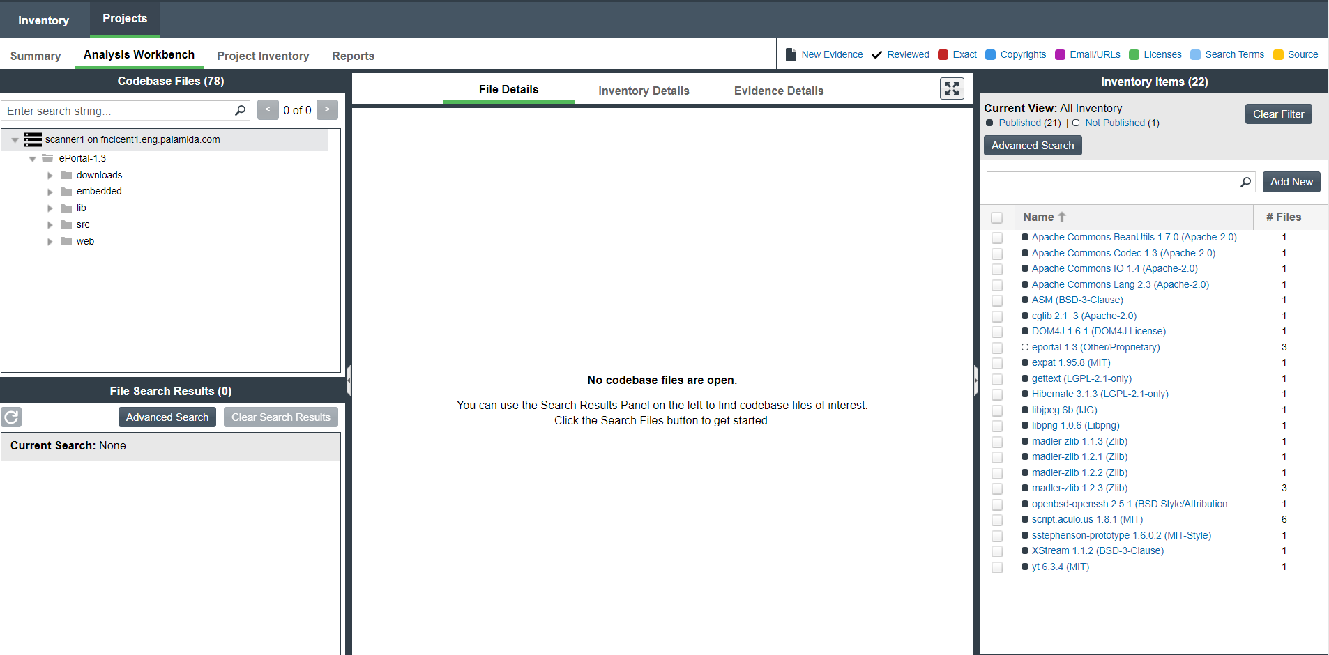The scanning of codebase files will not generate inventory items that have a matching CVL (Component Version License). However, if multiple inventory items with the same CVL are generated during scanning, these inventory items will be merged with an existing inventory item that has the same CVL, based on the recent updated timestamp of the inventory items. This process updates the Relationship field values, indicating whether it is Parent Inventory or Child Inventory and the Dependency Level field values, specifying whether it is Top-level, Direct, or Transitive on the Project Inventory Details pane—for the existing inventory item. It also updates the file associations in the Associated Files tab—both on the Project Inventory Details pane and on the Inventory Details pane in the Analysis Workbench —for the existing inventory item.